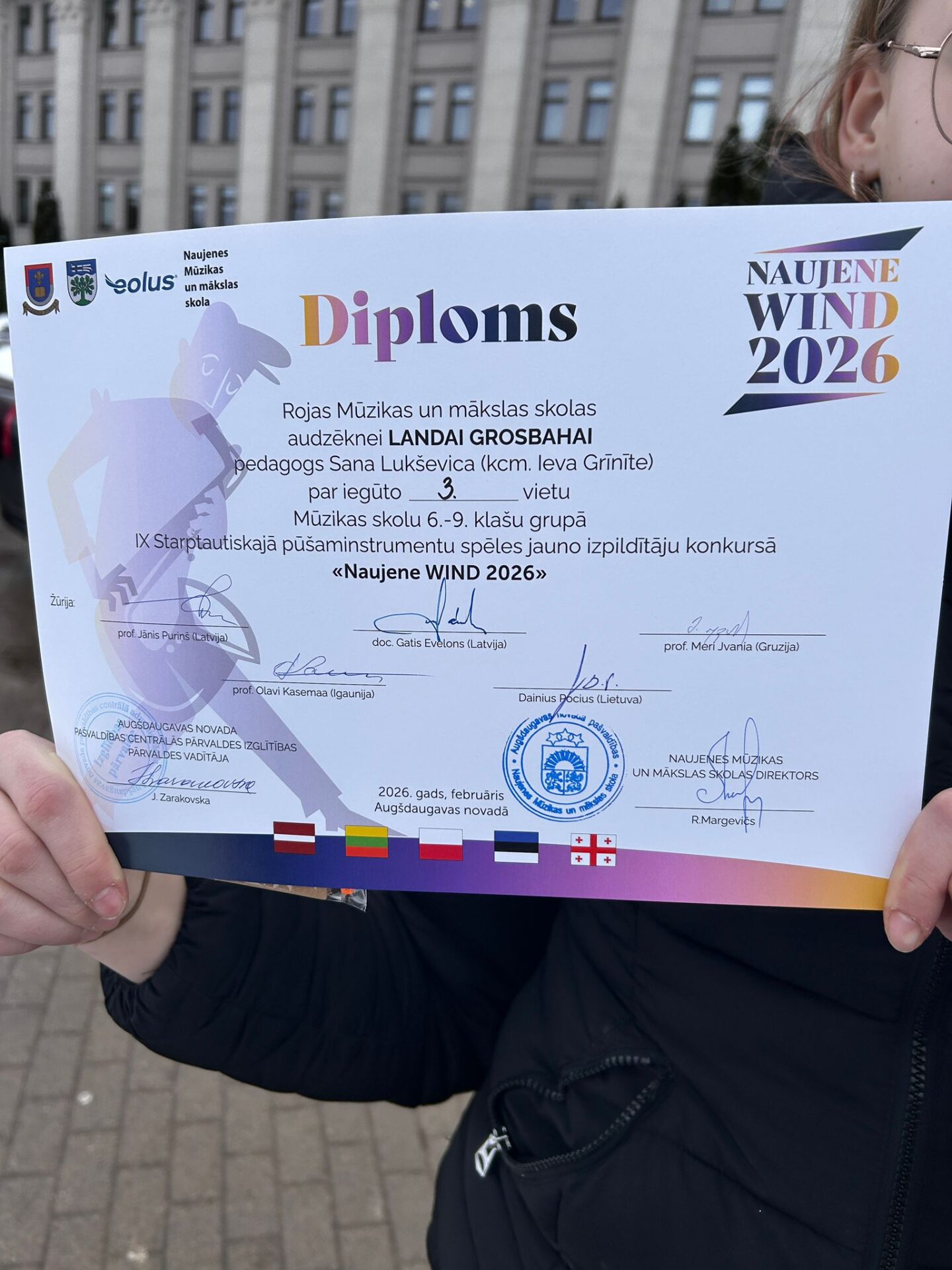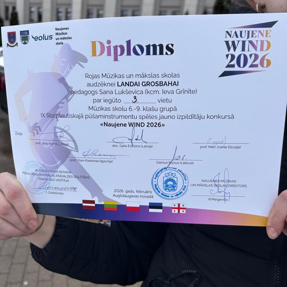 Sveicam ar panākumiem flautas spēles 6. klases audzēkni Landu Grosbahu, kura 25. februārī piedalījās IX Starptautiskajā pūšaminstrumentu spēles jauno izpildītāju konkursā “NAUJENE WIND 2026” un 6. – 9. klašu grupā izcīnīja 3. vietu. Konkursu rīkoja Naujenes Mūzikas un mākslas skola sadarbībā ar Augšdaugavas novada Kultūras pārvaldi un Daugavpils Universitāti. Konkursa dalībniekus vērtēja starptautiska žūrija: Jānis Puriņš, Gatis Evelons (Latvija), Meri Jvania (Gruzija), Olavi Kasemaa (Igaunija), Dainius Pocius (Lietuva).