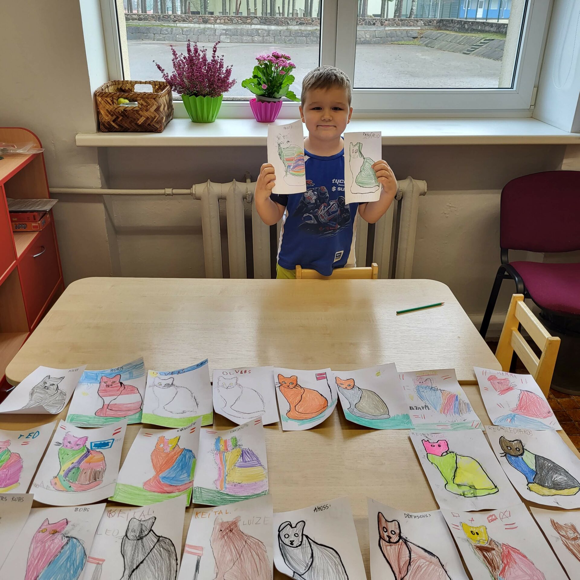 Kaķi mēģinājām pārzīmēt ar flomāstera un ūdens palīdzību, bet jau nākamajā nodarbībā iepazinām koppapīru un mēģinājām nokopēt uzreiz jau divus kaķus.