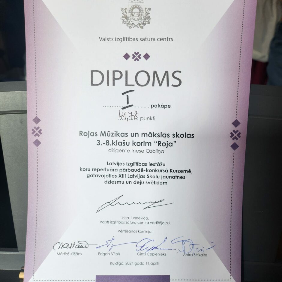 Sveicam 3.-8.klašu kori “Roja” ar iegūto I pakāpi Latvijas izglītības iestāžu koru repertuāra pārbaudē-konkursā Kurzemē, gatavojoties XIII Latvijas Skolu jaunatnes dziesmu un deju svētkiem. Paldies pedagogiem Inesei Ozoliņai, Dzintrai Tauniņai un koncertmeistarei Baibai Petkevičai!