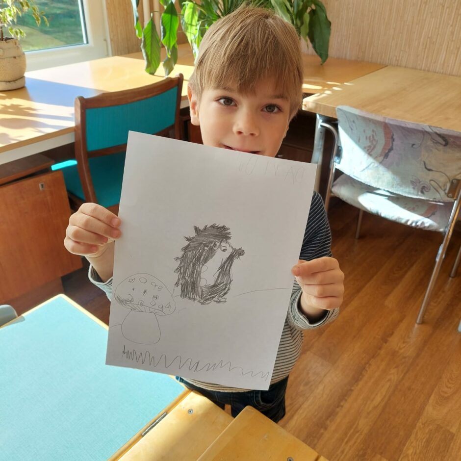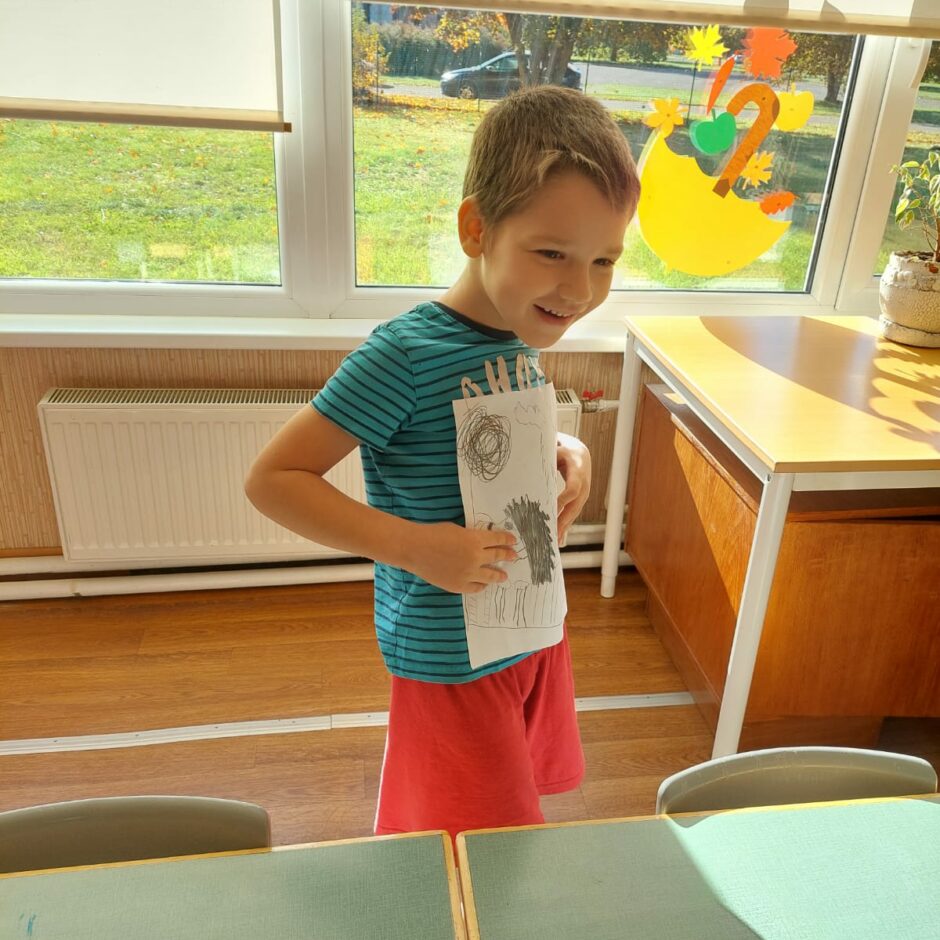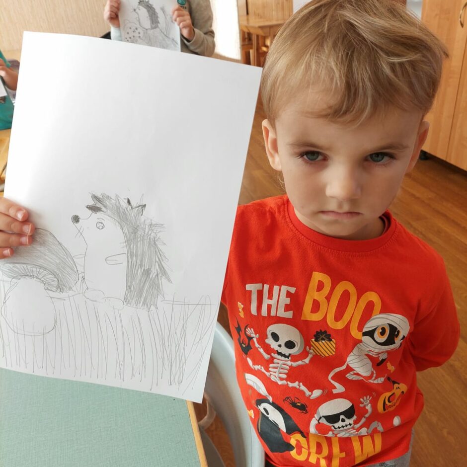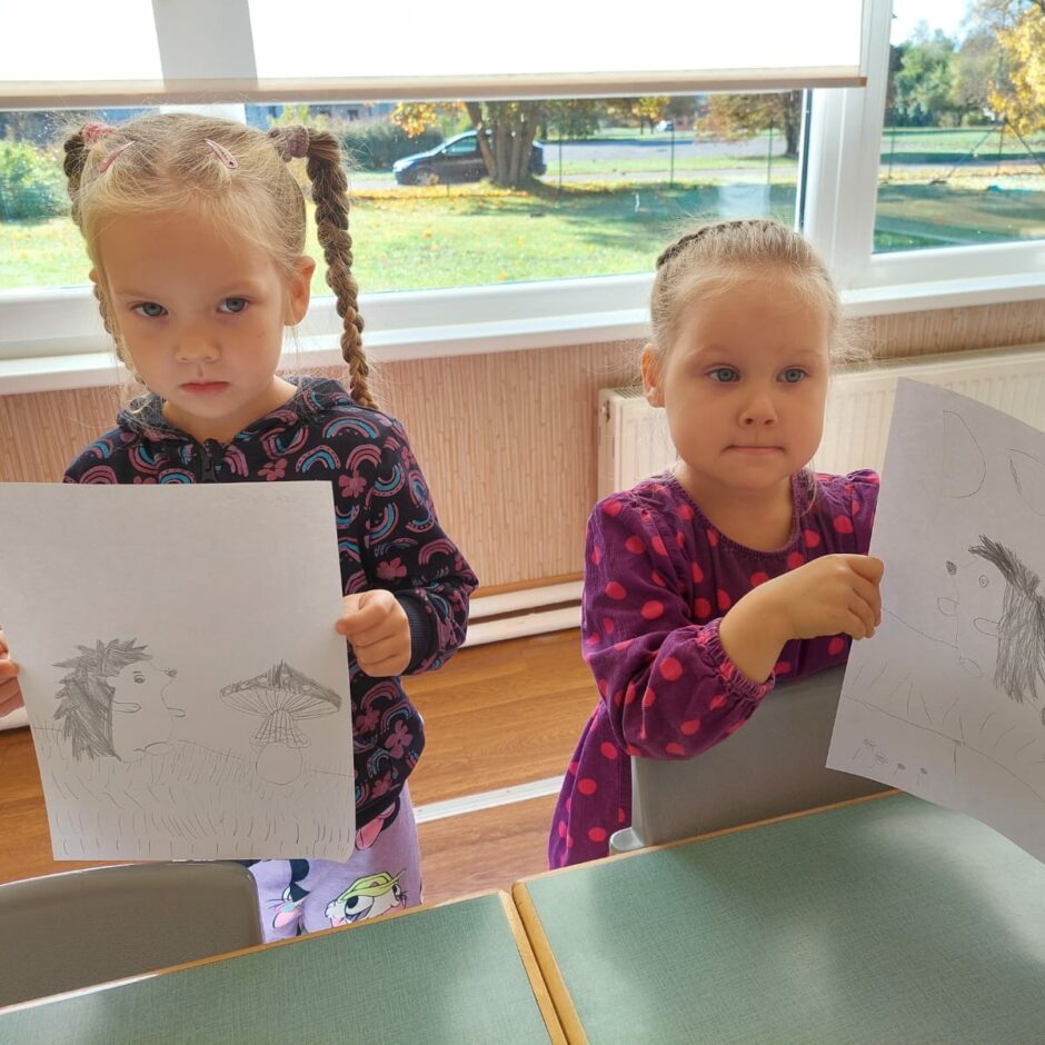 10.oktobrī pašiem mazākajiem bija praktisks darbiņš, kurā izmantoti tika trafareti ar ezi, sēnēm. Mazie ķērās pie darba un gala rezultātā tika izveidots grafisks zīmējums, kurā ezis dodas sēņu medībās.