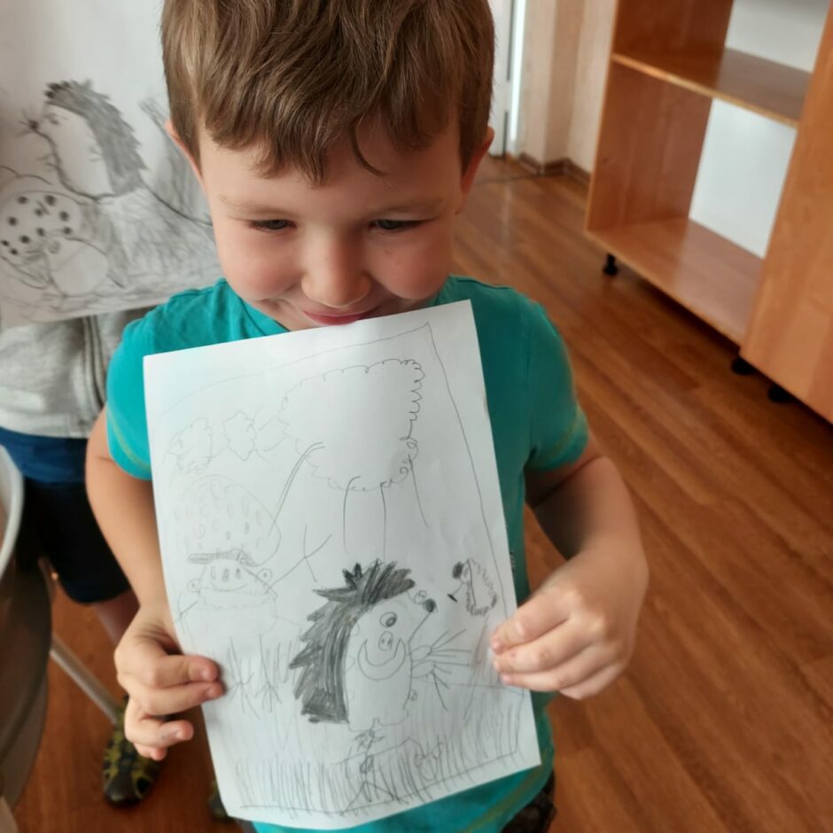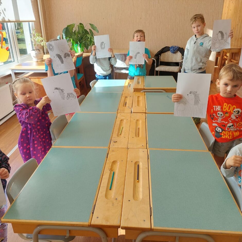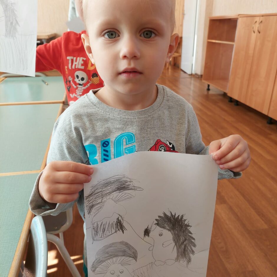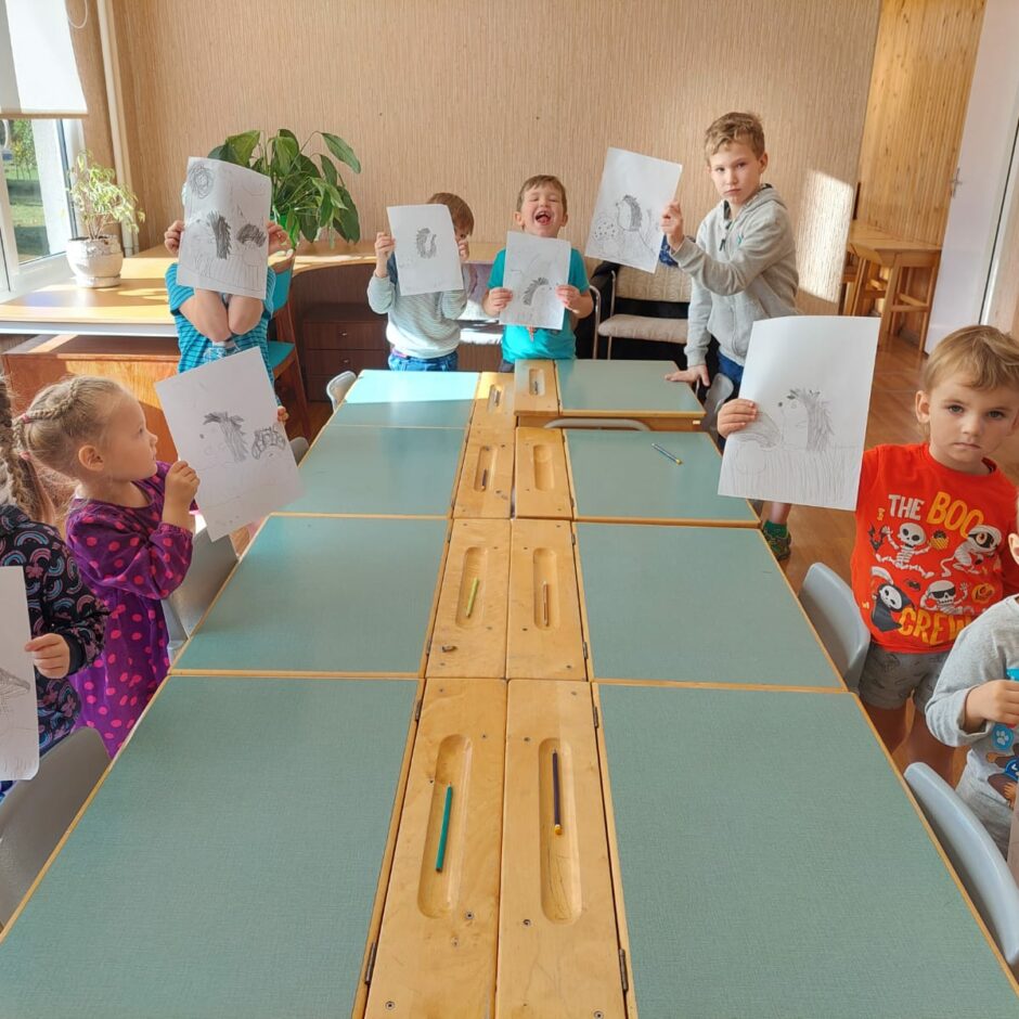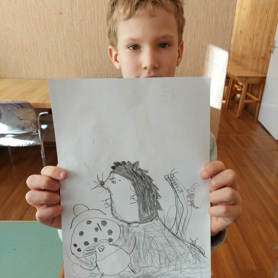 10.oktobrī pašiem mazākajiem bija praktisks darbiņš, kurā izmantoti tika trafareti ar ezi, sēnēm. Mazie ķērās pie darba un gala rezultātā tika izveidots grafisks zīmējums, kurā ezis dodas sēņu medībās.